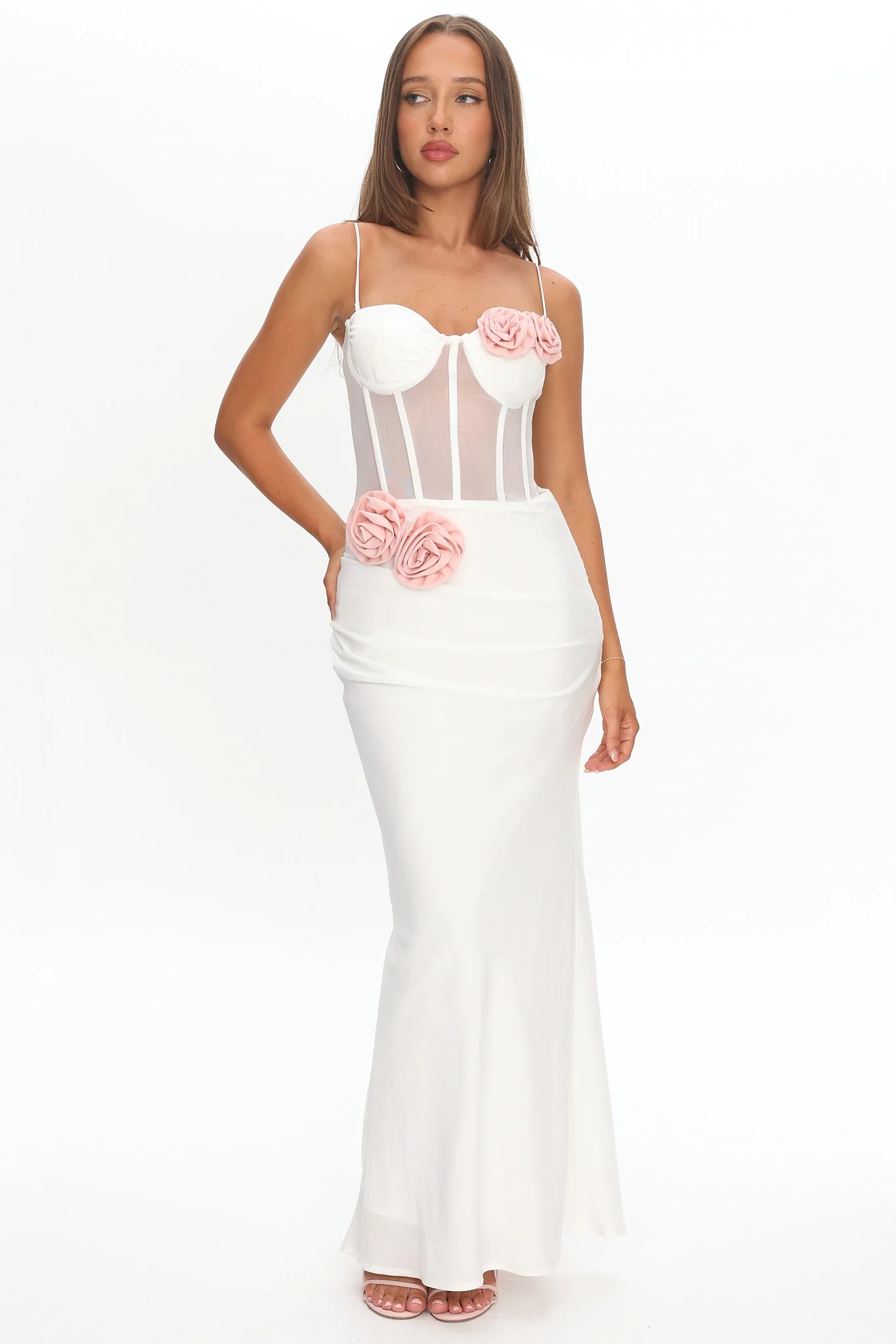 Ismera Sheer Bodice Rosette Maxi Dress White